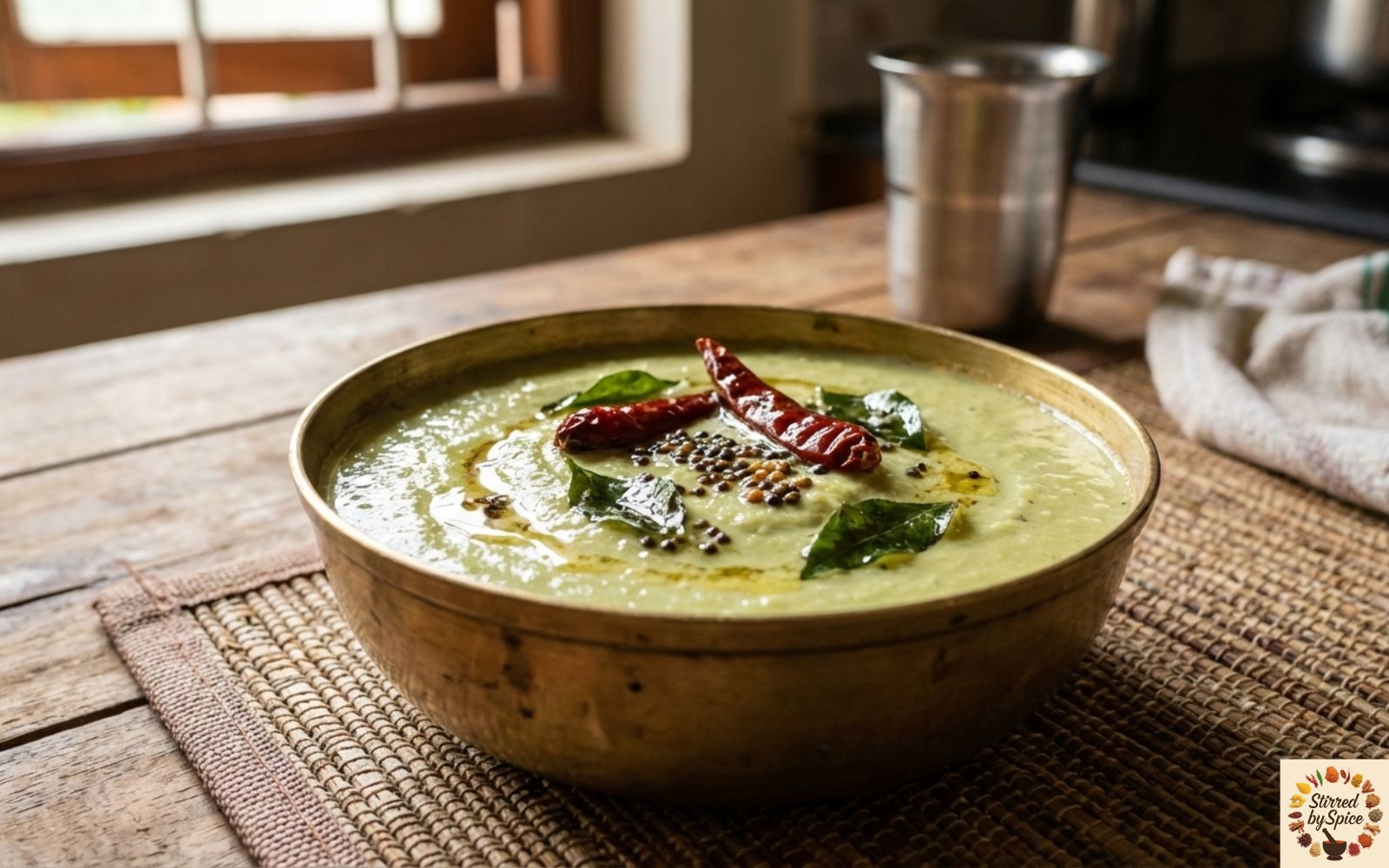 A cool, creamy chutney brightened with chilies and fragrant tempering β the perfect companion for every South Indian tiffin.