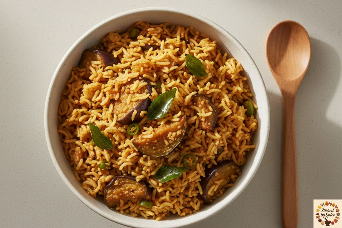 Vangi Bath rewards attention — layered spice, softened brinjal, and rice that carries memory.
